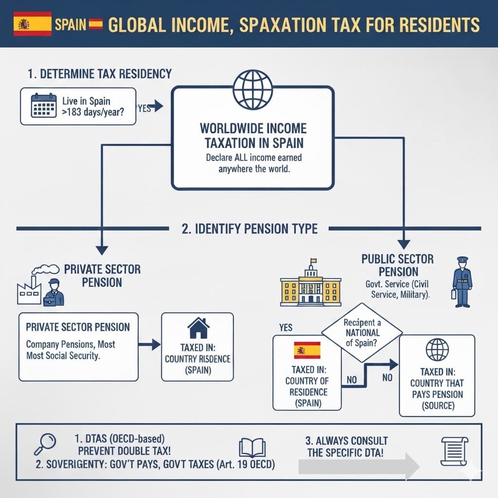 Since Spain taxes worldwide income, the potential for double taxation (being taxed on the same income in Spain and the country of origin) is high. This is where the DTAs become critical. The DTA rules you cited determine which country has the primary right to tax a specific pension: