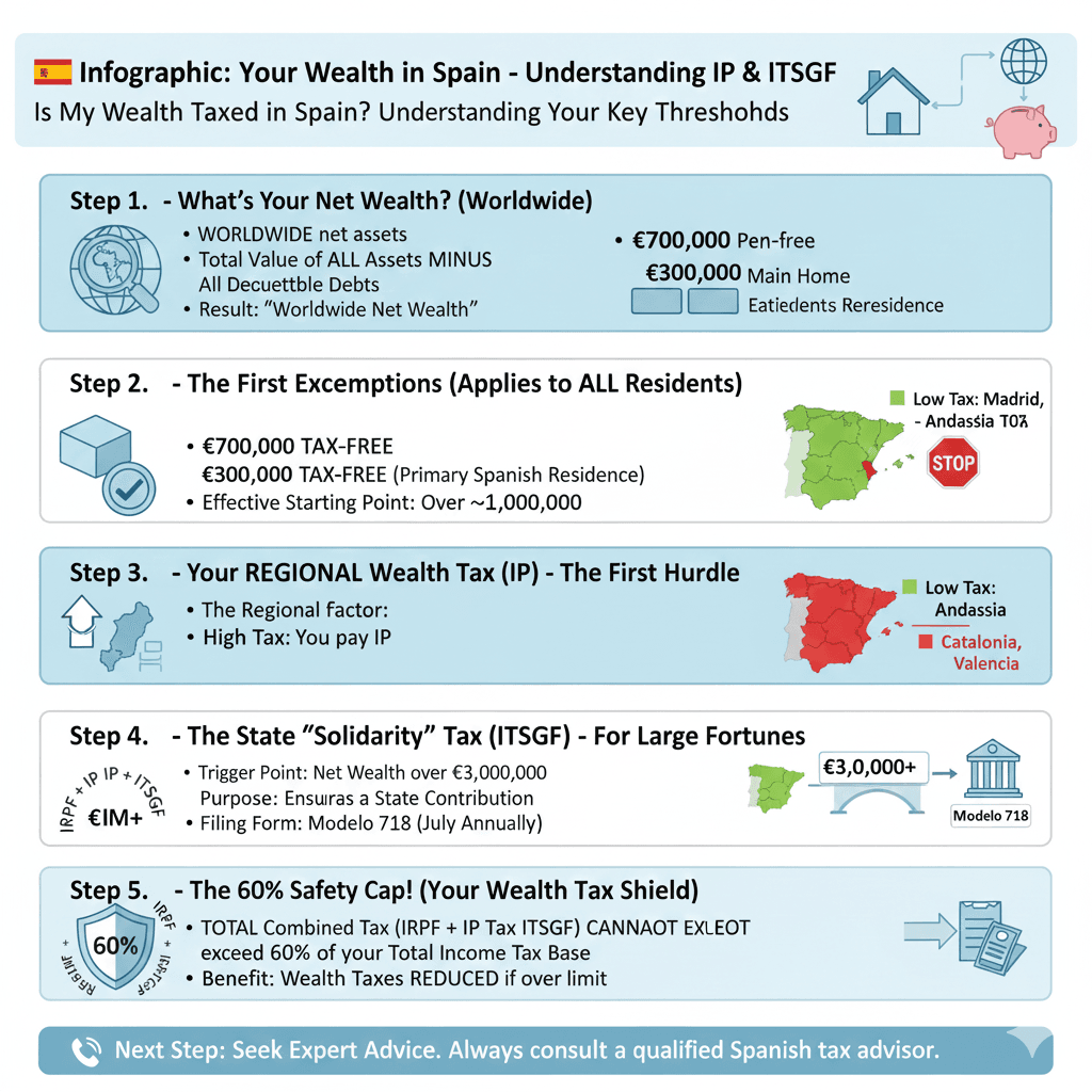 | The 60% Safety Cap | Your total combined tax bill for Income Tax + Wealth Tax + ITSGF cannot exceed 60% of your income tax base. This prevents the combined taxes from becoming excessive. |
